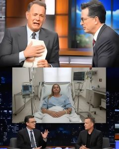 In a stunning farewell moment that silenced the studio audience, Stephen Colbert—poised to end his iconic 30-year late-night legacy—sat beside Tom Hanks on CBS and played never-before-heard audio from Virginia Giuffre’s final 30 minutes on her hospital bed, fragments of a brave woman’s dying voice exposing entrenched secrets of power, purchased silence, and profound betrayal.